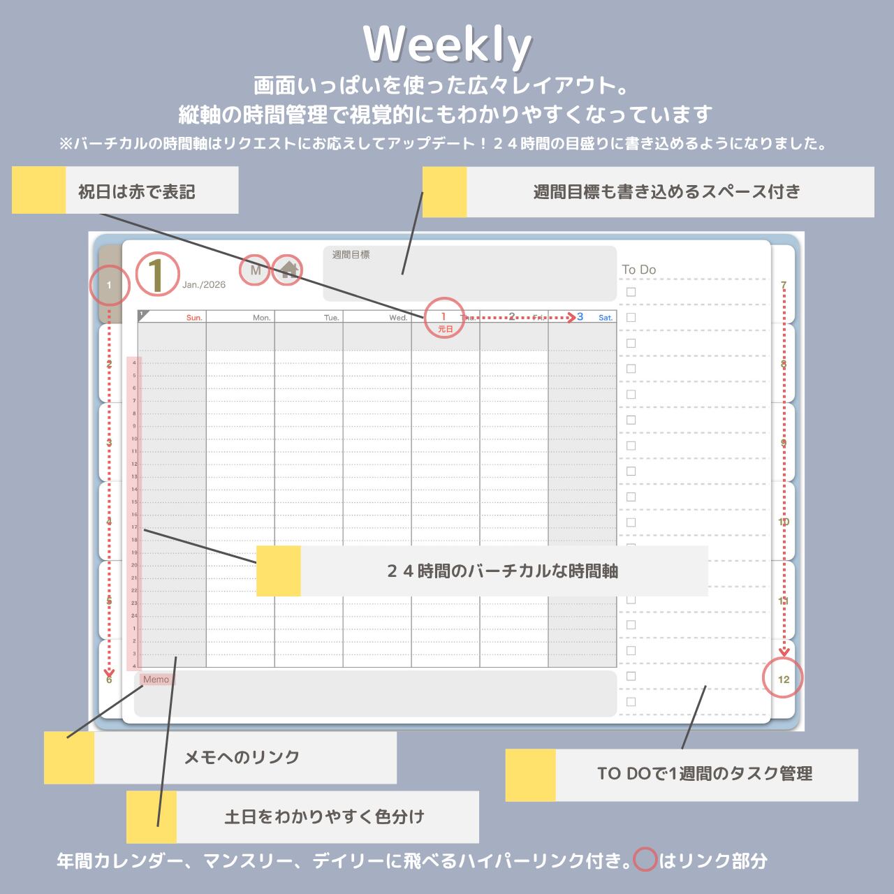 PDFデータでハイパーリンク機能を搭載!GoodNotes5または6アプリで読み込んで使用することで、ワンタップでリンク先にジャンプすることができ、非常に便利です。
