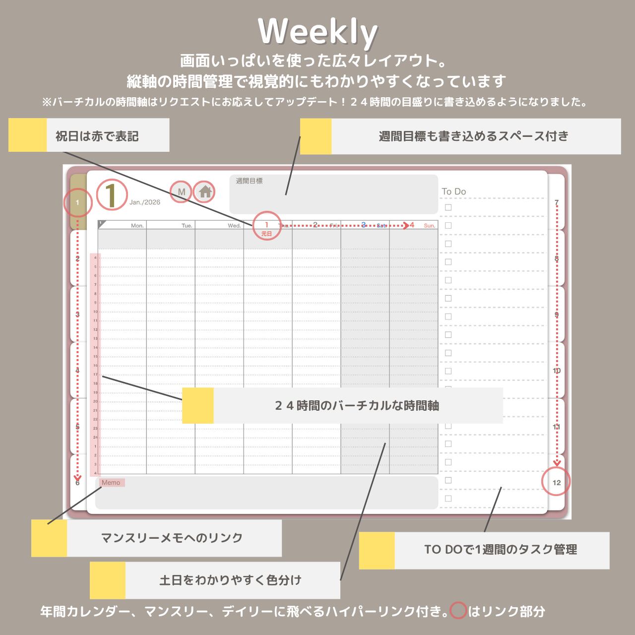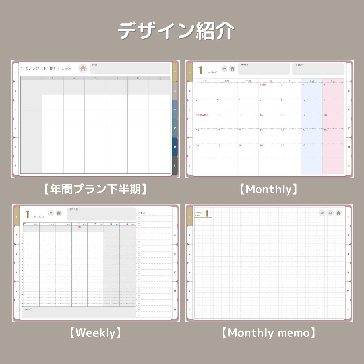 手帳は2026年1月〜12月までを収録。月曜始まりの日付入り、日本の祝日入りテンプレートです。365日のダイアリー付き!全471ページの大容量!!