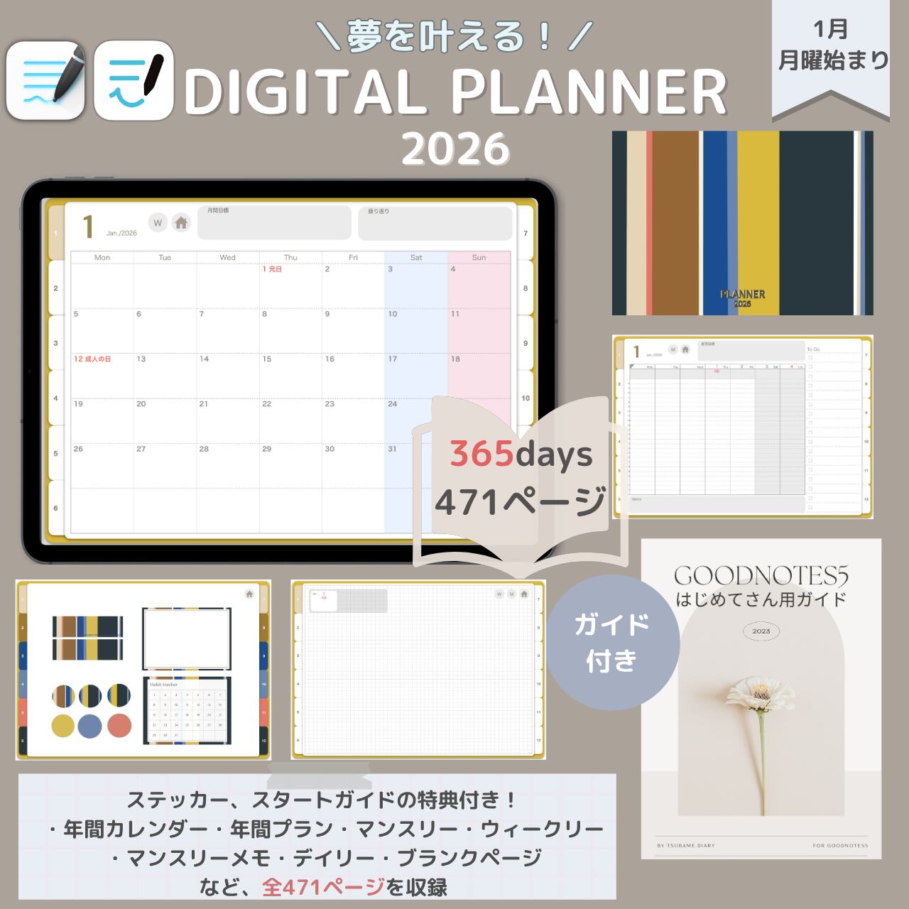 手帳は2026年1月〜12月までを収録。月曜始まりの日付入り、日本の祝日入りテンプレートです。365日のダイアリー付き!全471ページの大容量!!