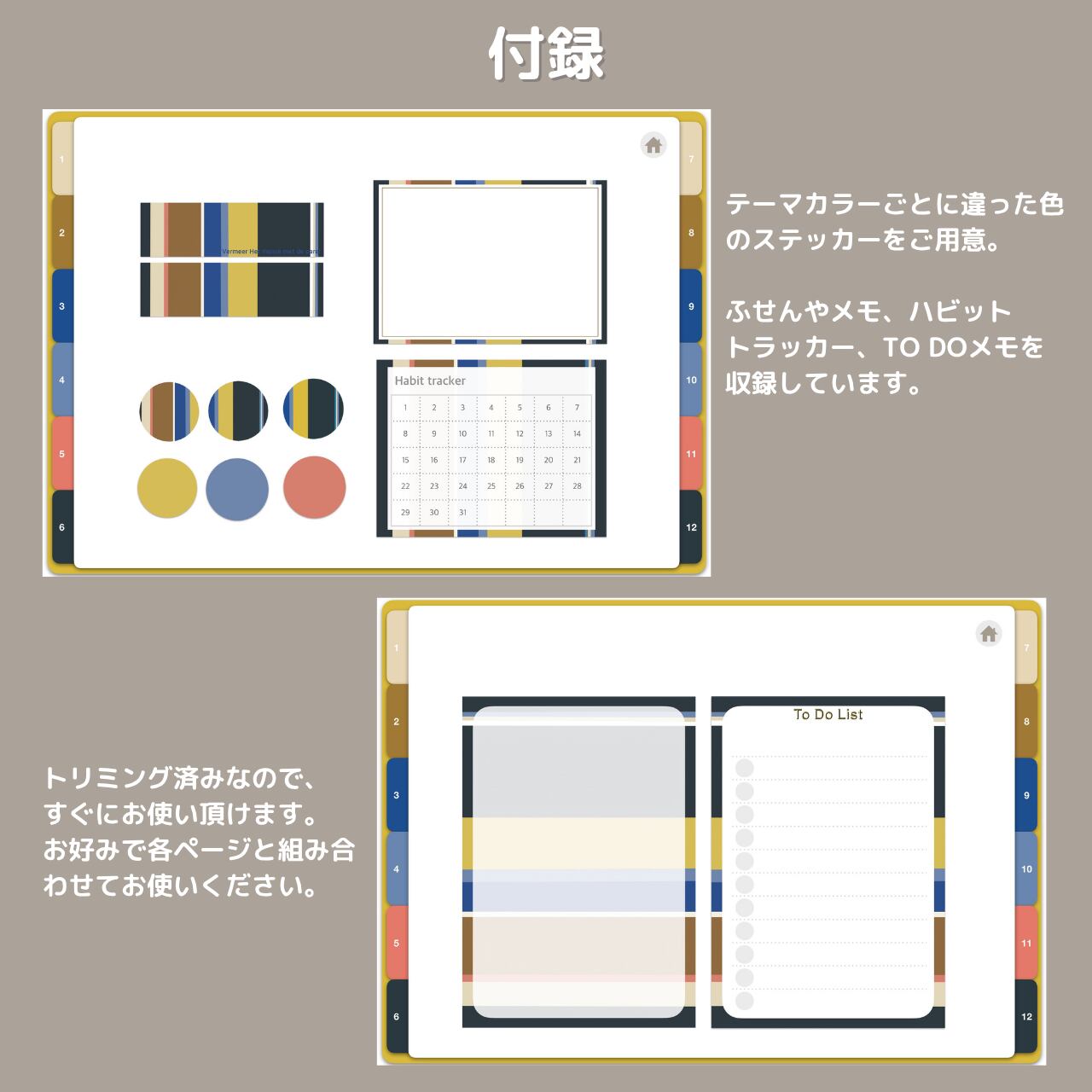 テーマカラーとお揃いのカラーで製作した、オリジナルステッカーをご用意。ハビットトラッカーやTO DOメモ、付箋などついておりますので、好きなページに、お好みの配置と大きさでご使用ください。
