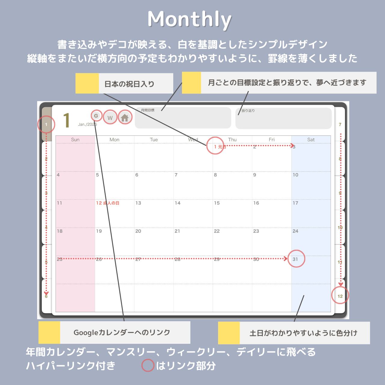 【夢を叶えるデジタルプランナー2026年/1月/日曜始まり収録内容】