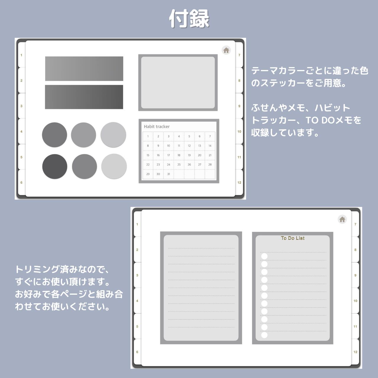 テーマカラーとお揃いのカラーで製作した、オリジナルステッカーをご用意。ハビットトラッカーやTO DOメモ、付箋などついておりますので、好きなページに、お好みの配置と大きさでご使用ください。