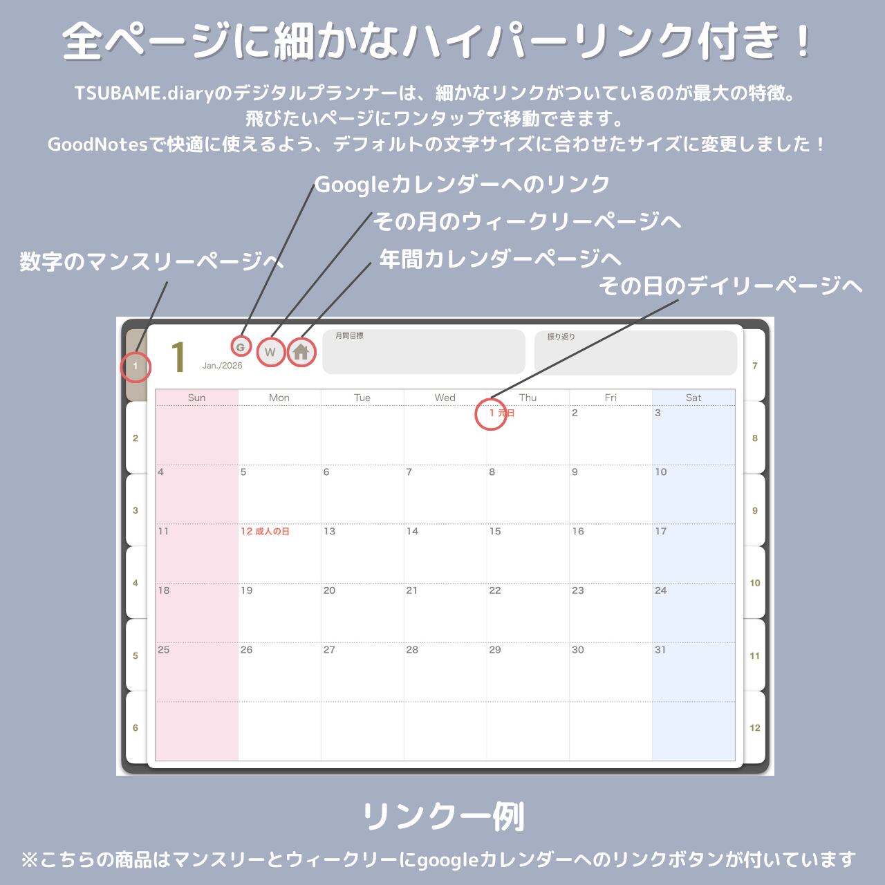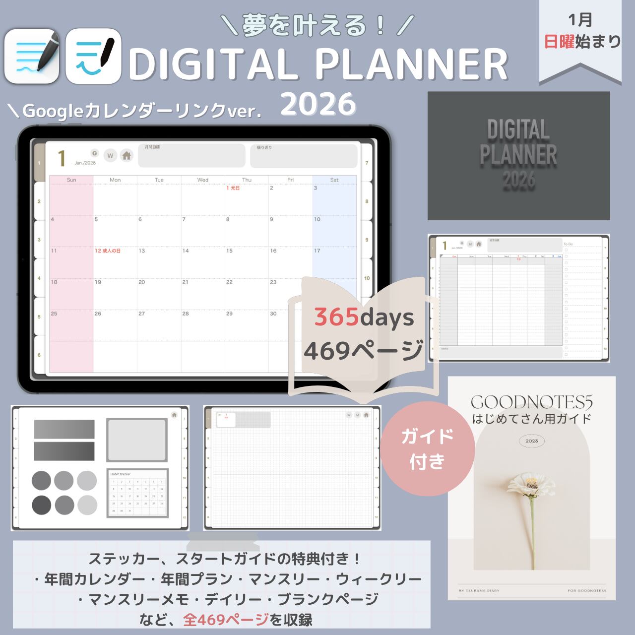 夢を叶える!2026デジタルプランナー365日のページ付き(日曜/1月始まり)【googleカレンダーリンク版】GoodNotes5、6