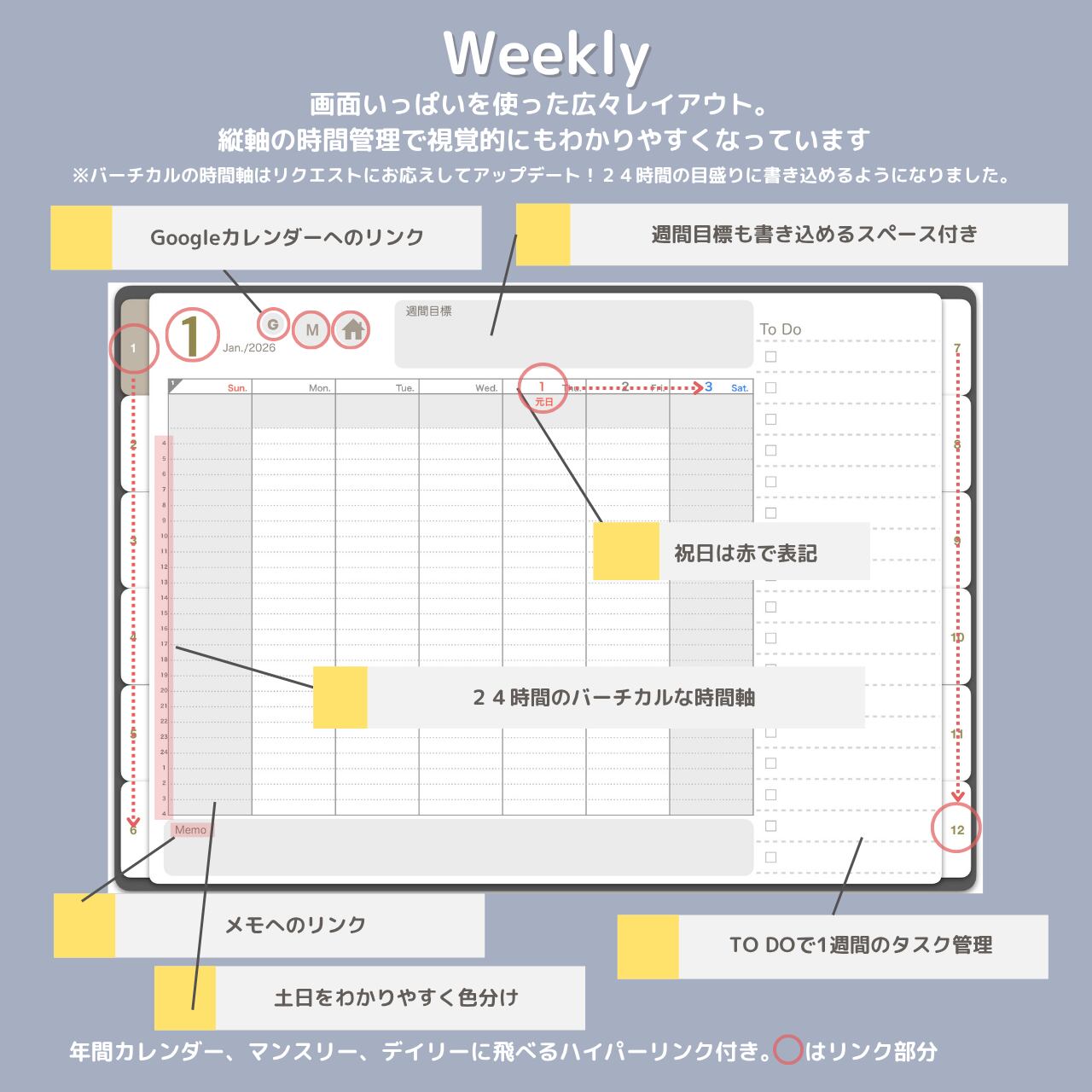 PDFデータでハイパーリンク機能を搭載!GoodNotes5または6アプリで読み込んで使用することで、ワンタップでリンク先にジャンプすることができ、非常に便利です。