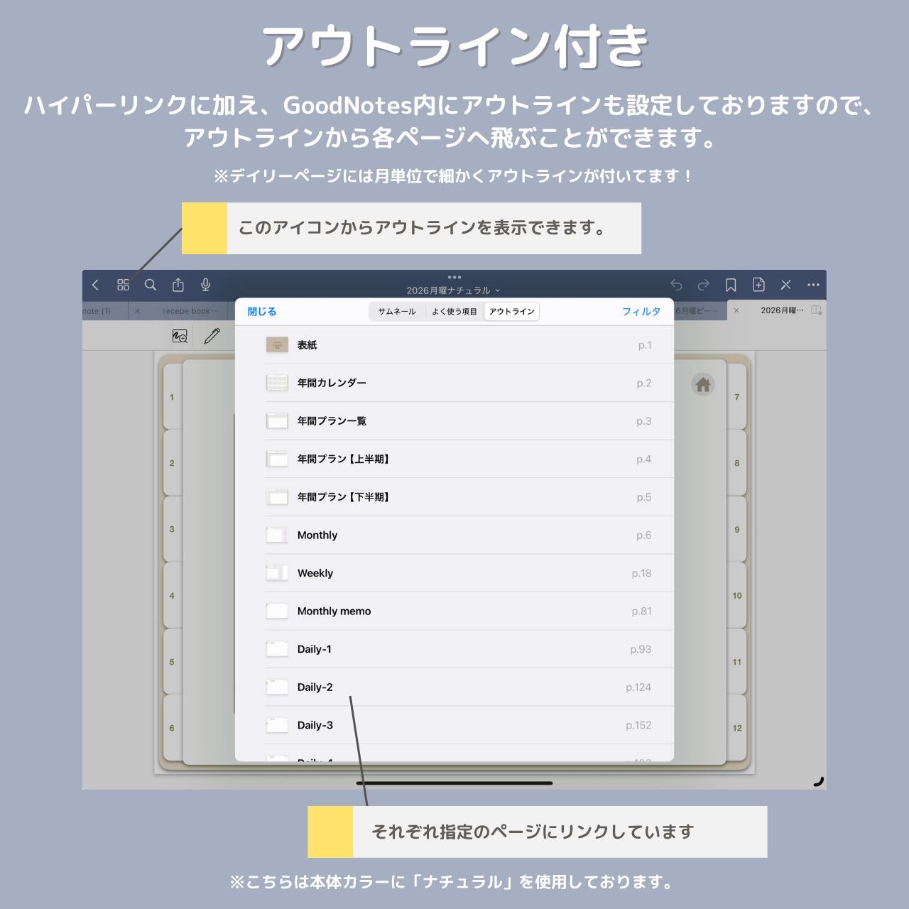 GoodNotesに読み込んだ際、アウトライン(目次)も設定済みです。