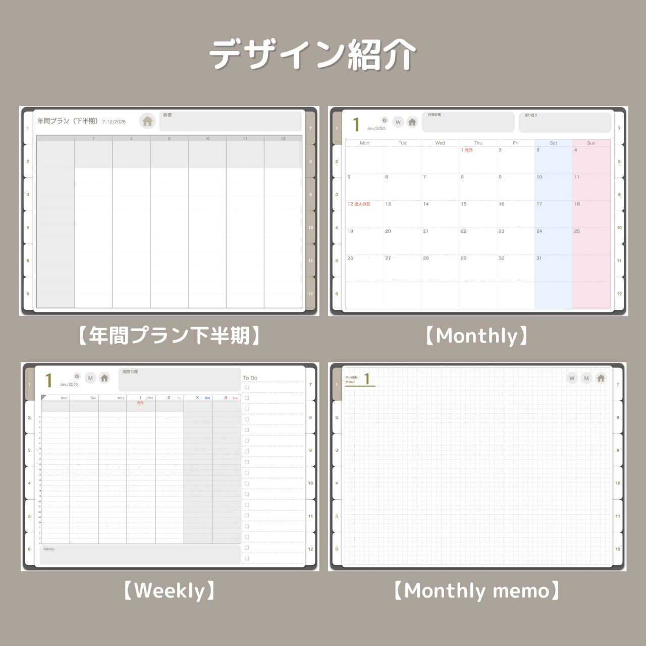 手帳は2026年1月〜12月までを収録。月曜始まりの日付入り、日本の祝日入りテンプレートです。365日のダイアリー付き!全471ページの大容量!!